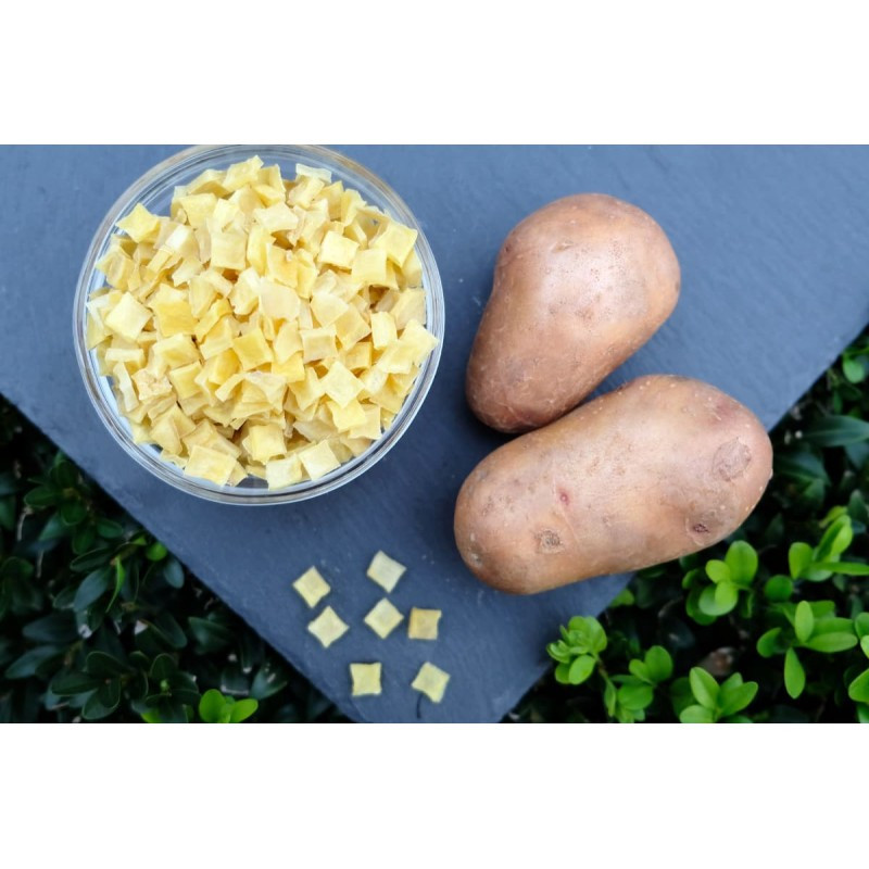 У сушеній картоплі є натрій, калій, фосфор, залізо, магній. Вітаміни: E, D, P С, PP, В. Але їх трохи менше, ніж у свіжій картоплі. У ста грамах сушеної картоплі міститься 298 ккал. Білок із сушеної картоплі близький за своїм складом до тваринних білків, а амінокислоти добре збалансовані та швидко засвоюються організмом.