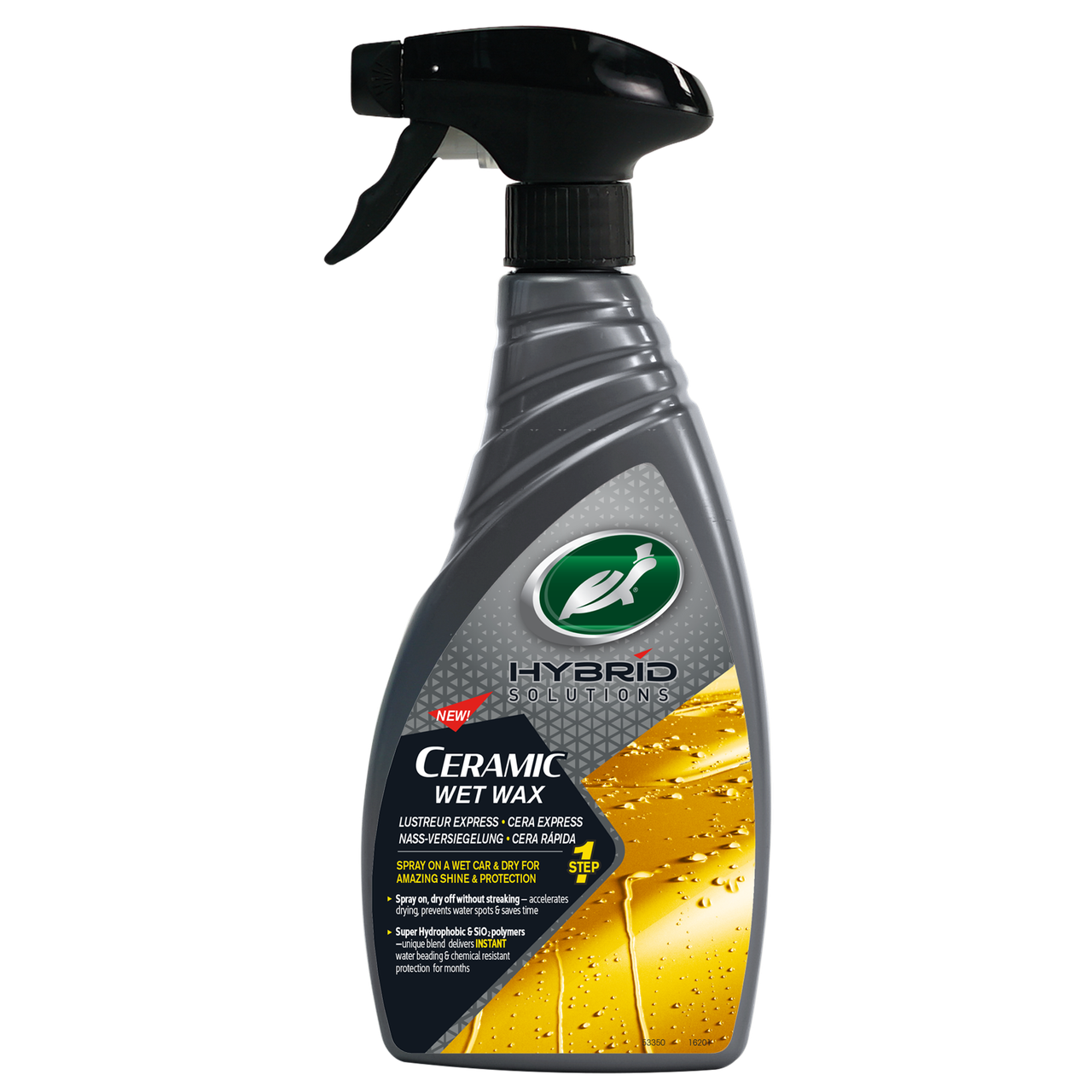 Поліроль для вологого кузова з керамікою Turtle Wax HS Ceramic Wet Wax – відноситься до нової революційної лінійки продуктів Turtle Wax Hybrid Solutions. Ця поліроль є інноваційним продуктом, що призначений для нанесення на вологий кузов одразу після мийки авто. Замість того, щоб протирати та висушувати кузов автомобіль після мийки і вже потім наносити класичний поліроль, за допомогою Turtle Wax Ceramic Wet Wax можна робити це одночасно! Просто вимийте та сполосніть автомобіль і розпиліть на мокрий кузов Turtle Wax HS Ceramic Wet Wax. Без попередньої сушки авто. У процесі витирання полімерні воски взаємодіють з краплями води, відштовхуючи їх від кузова, що запобігає появі соляних водних розводів після висихання. Полімерні воски після застигання покращують світовідбивну здатність лакофарбового покриття і надаючи кузову яскравого та насиченого кольору. На останок, після розполіровки на поверхні автомобіля утворюється тонкий шар керамічної плівки діоксиду кремнію SiO2, що є надміцним та гідрофобним покриттям (так звана Кераміка). Завдяки своїй міцності керамічне покриття захищає кузов від УФ-променів (вицвітання) та хімічно агресивних забруднень (смол, нафтових плям). Гідрофобність керамічного покриття гарантує значно менше прилипання пороху, пилу, дощових брудних крапель тощо. Переваги Поліроль для вологого кузова з керамікою Turtle Wax HS Ceramic Wet Wax: • революційна лінійка продуктів Turtle Wax Hybrid Solutions – синтетичні полімери та керамічний захист; • наноситься відразу на мокрий кузов після мийки; • створює міцне керамічне гідрофобне покриття; Застосування Поліроль для вологого кузова з керамікою Turtle Wax HS Ceramic Wet Wax: 1. Помийте та сполосніть свій автомобіль як завжди. 2. Поки автомобіль ще вологий, рясно нанесіть засіб на всі зовнішні поверхні, включаючи скло, пластик і гумові елементи, починаючи з даху. 3. Після ретельного обприскування засобом, вода почне стікати з автомобіля. 4. Використовуючи тканину з мікрофібри або м’який бавовняний рушник, зберіть залишки води (за необхідності) одночасно розтираючи засіб. 5. Віск затвердіє під час висихання та створить надзвичайний глянсовий блиск та захист. 6. Додатково створиться тонка керамічна захисна плівка. Поради виробника: перед використанням добре струсіть флакон. Після розполіровки не мочіть кузов протягом 1-2 годин для кращої полімеризації керамічного покриття. Зберігання та догляд: зберігайте продукт у межах від 0 ºC до +40 ºC. Не допускайте зберігання під прямими сонячними променями або поблизу гарячих поверхонь. Не допускайте замерзання продукту.